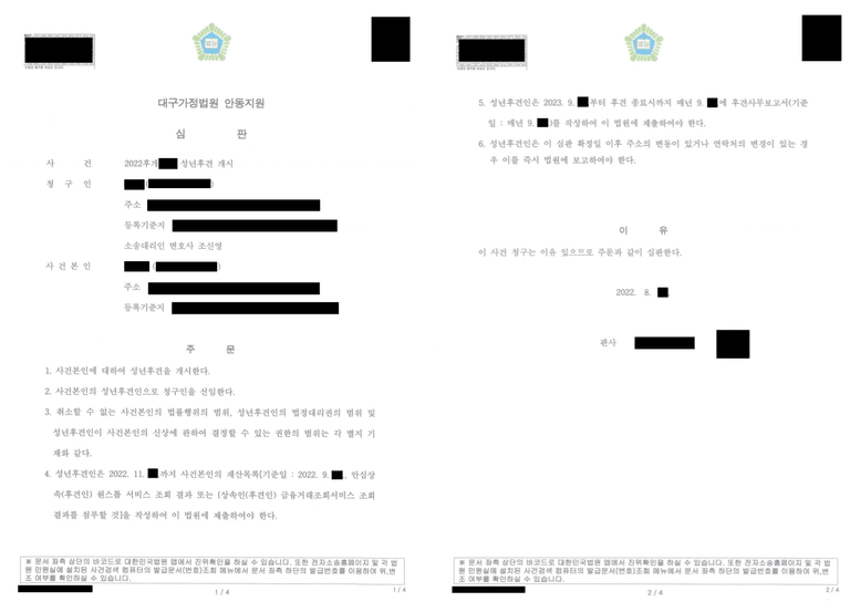 다만, 이 사건의 경우 어머니가 나이가 많으셔서 성년후견개시심판청구에 필요한 구비서류들을 준비하기 어려운 상황이었는데요. 그래서 서류 준비하는 것을 직접 다 챙겨드려야 했던 만큼 오래토록 기억에 남을 것 같습니다.