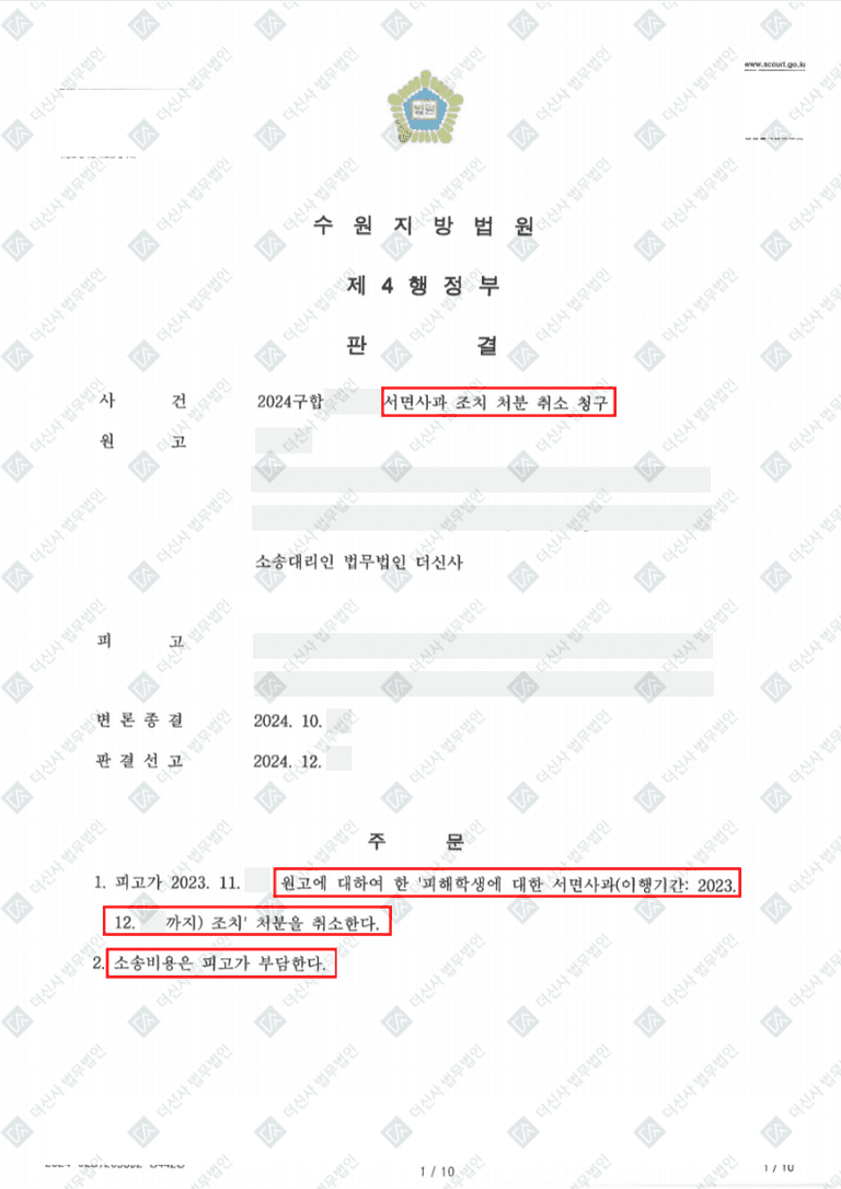 이번 사건은 본 법무법인이 중학생 의뢰인을 대리해 진행한 ‘서면사과 조치 처분 취소청구 소송’에서,