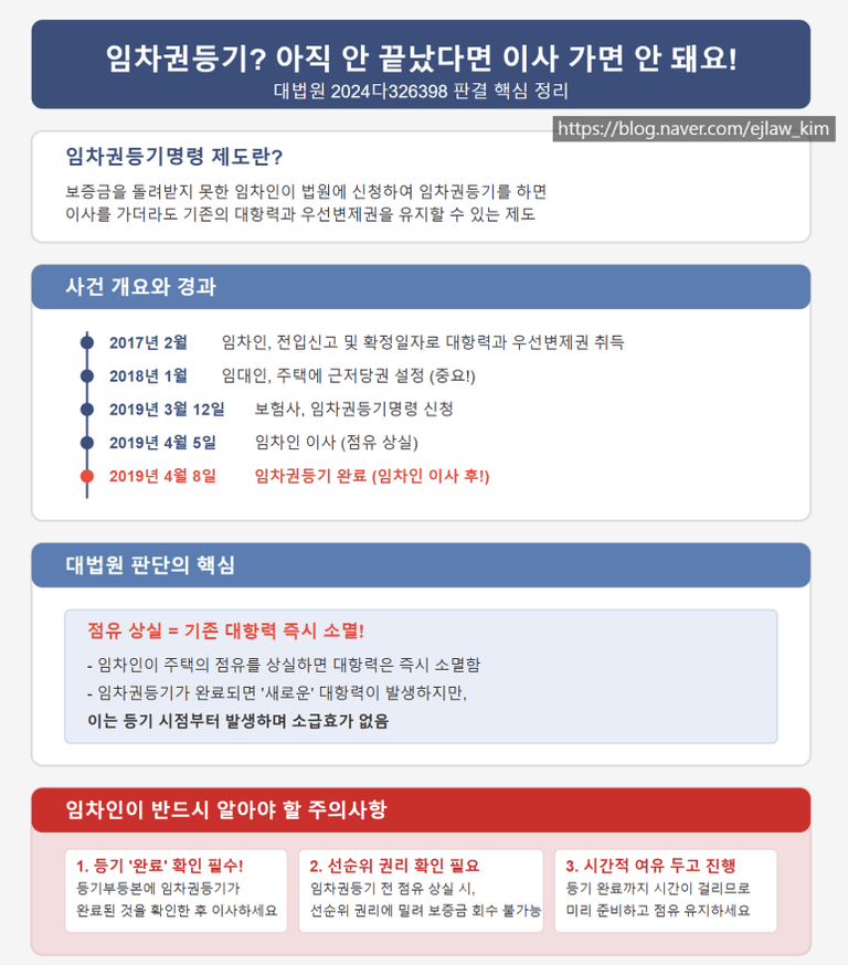 이번 대법원 판결(2024다326398)은 임차권등기 완료 전 점유 상실의 위험성을 명확히 보여주었습니다. 부디 이 글을 통해 임차권등기명령 제도를 이용하실 때 유의할 점을 숙지하시고, 소중한 보증금을 안전하게 지키시길 바랍니다.