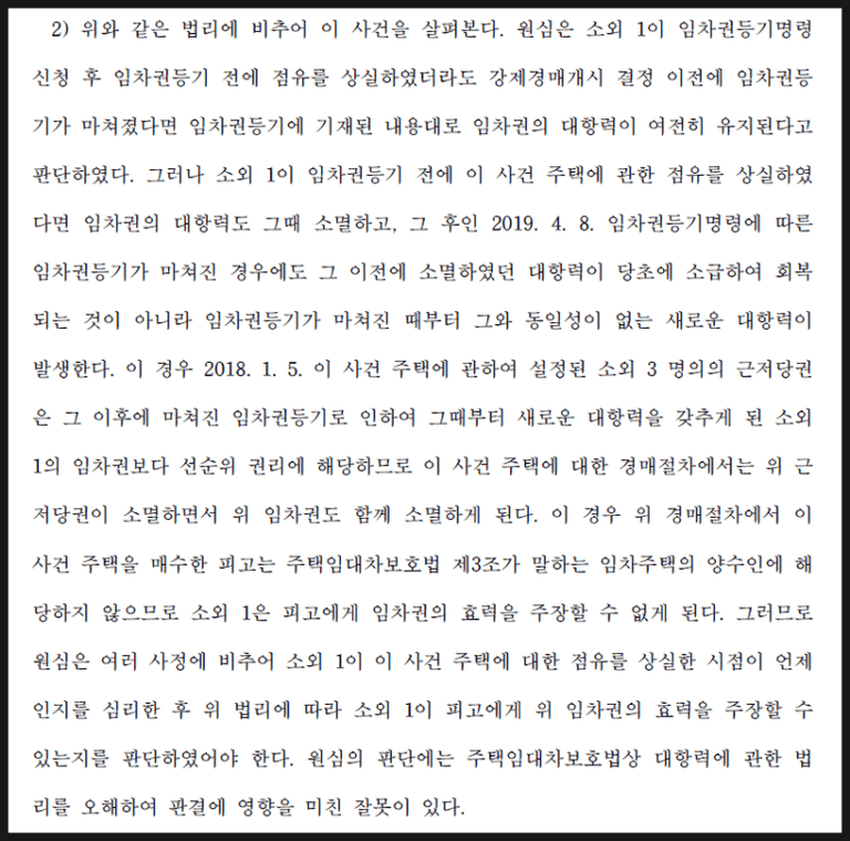 대법원은 임차권등기가 등기부등본에 실제로 기록되기 전에 임차인이 점유를 상실하면 기존 대항력은 그 즉시 소멸하고,