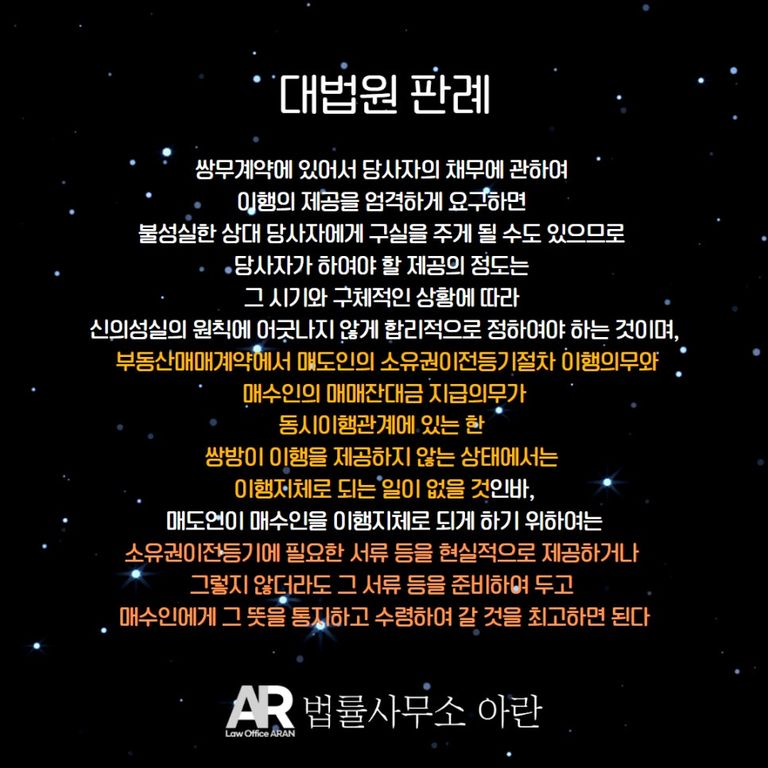 ※ 오늘 포스트에서는 매도인에게 등기이전의무만 있음을 전제로 설명드렸습니다만, 매도인이 잔금 지급과 동시에 인도, 근저당 말소 등을 해 주기로 약정한 경우에는 그 의무도 함께 이행(제공)되어야 합니다.