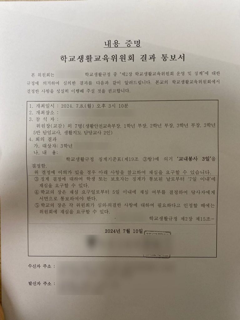 학교에서 학생의 징계 관련해서 행정적인 실수를 정말 많이 했더군요. 일단 생활교육위원회 소집 통지를 구두와 전화를 통해서 통보했습니다. 등기를 보내긴 했는데, 주소를 잘못 입력해서 엉뚱한 곳으로 배달되어서 학생과 어머님 모두 서면으로는 통지서를 받지 못한 상황이었습니다. 이 하자는 좀 심각한 하자입니다. 그런데 일단 이 거는 문제삼지 않기로 했어요.
