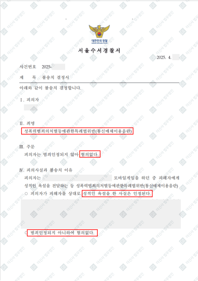 이번 사례는 통매음 혐의로 입건된 의뢰인이 본 법무법인의 전략적 대응을 통해 증거불충분으로 혐의없음(불송치) 처분을 받은 성공적인 사건입니다.
