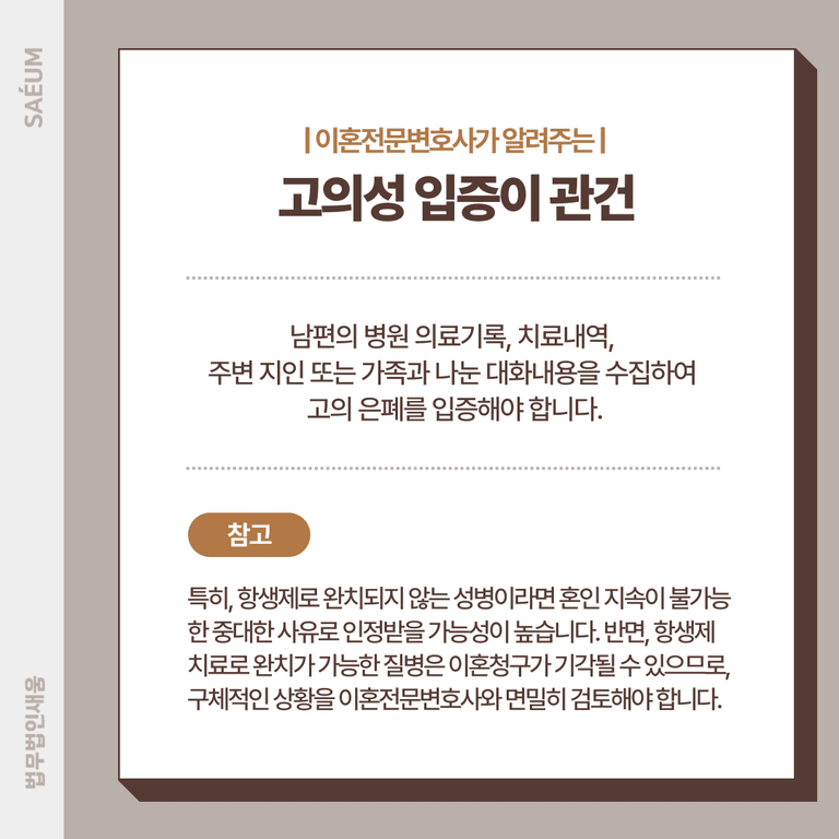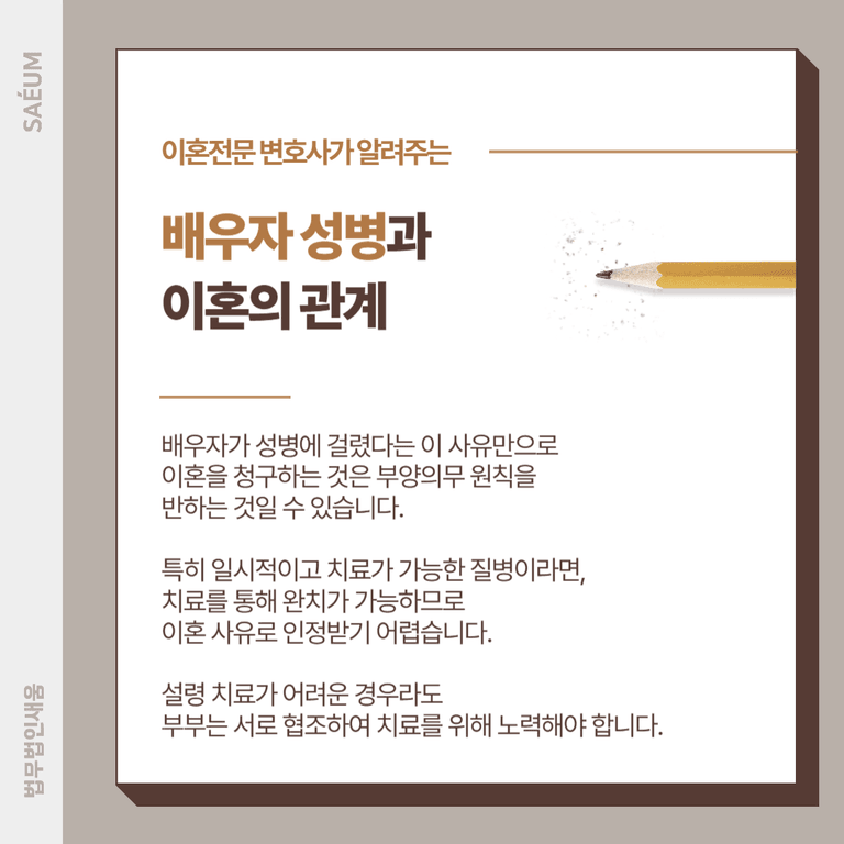 반면, 단순한 항생제 치료로 완치가 가능한 질병은 이혼청구가 기각될 수 있으므로, 구체적인 상황을 이혼전문변호사와 면밀히 검토해야 합니다.