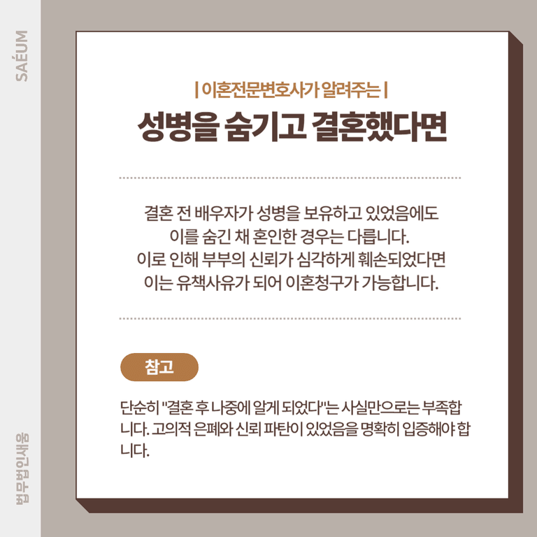 단순히 "결혼 후 나중에 알게 되었다"는 사실만으로는 부족합니다. 고의적 은폐와 신뢰 파탄이 있었음을 명확히 입증해야 합니다.