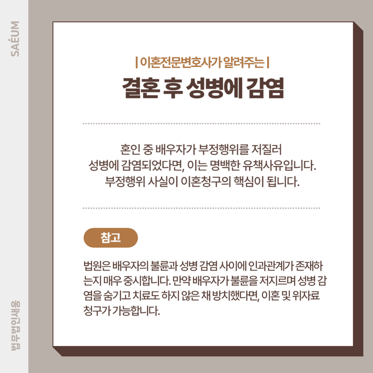 만약 배우자가 지속적으로 불륜을 저지르며 성병 감염을 숨기고 치료도 하지 않은 채 방치했다면, 신체적·정신적 고통을 입힌 것으로 인정되어 이혼 및 위자료 청구가 가능합니다.