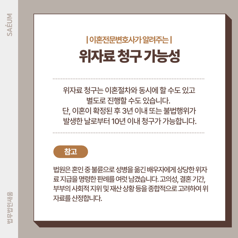 위자료 청구는 이혼절차와 동시에 할 수도 있고, 별도로 진행할 수도 있습니다. 단, 이혼이 확정된 후 3년 이내 또는 불법행위가 발생한 날로부터 10년 이내 청구가 가능합니다. 자신에게 유리한 자료와 증거를 최대한 확보해, 보다 높은 금액의 위자료를 받을 수 있도록 이혼전문변호사의 조력을 받으시기 바랍니다.