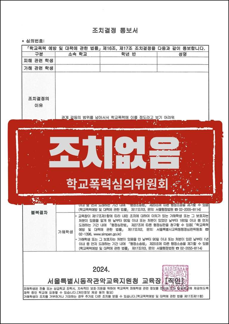 맞폭신고로 인하여 가해학생에게 중한 조치가 내려지고 피해학생에게 경한 조치가 내려진다고 한들, 피해학생의 학부모님들은 굉장히 큰 충격을 받습니다. 이 때문에 신고과정에서 합의하여 학교장 재량조치로 사안이 종결되곤 합니다.