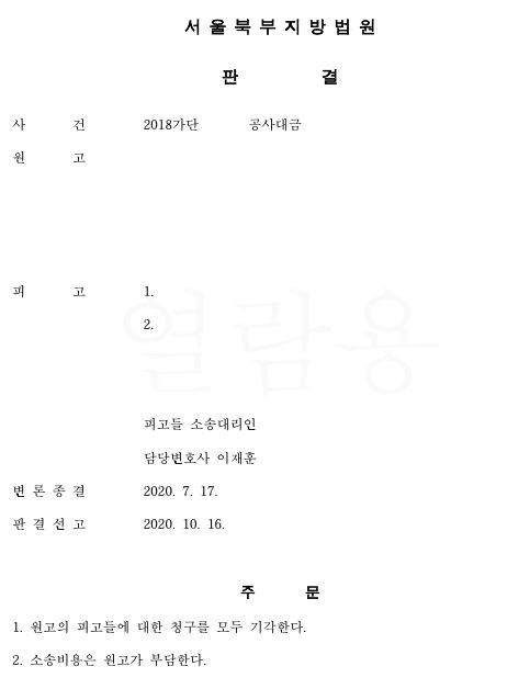 피고들을 대리하여 공사대금 사건에서 전부 기각을 구한 사안