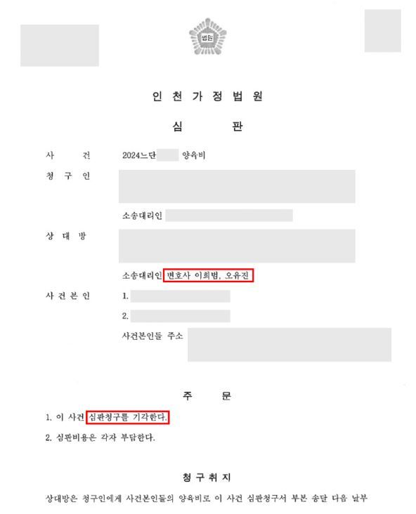 재판부는 양육비 증액에 관한 심문을 연후 판결을 내리면서 저희의 주장대로 당사자의 나이 가족관계, 소득과 재산 규모의 변화, 사건 본인의 나이, 양육상황 및 물가수준, 양육비를 정한 이후 경과한 시간 등을 기초로 사건본인의 성장에 따라 필요한 양육비가 증가할 필요성이 있는 지 등을 검토한 후 청구인의 양육비 증액청구는 이유 없다고 청구를 기각하는 판결을 하여 좋은 결과로 마무리 지을 수 있었습니다.