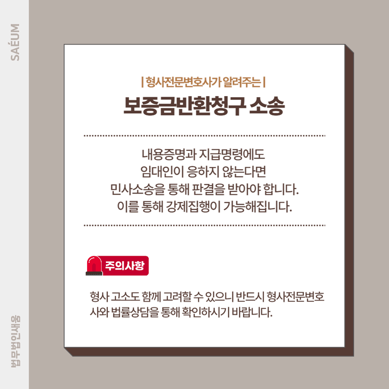 민사소송은 시간이 오래 걸리고 절차가 복잡한 만큼, 전세사기 및 보증금 미반환 사건 경험이 풍부한 변호사와 함께 대응하시길 권합니다.