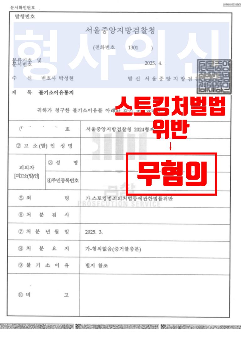 서울중앙지방검찰청의 검사는 법률사무소 유(唯)의 형사전문변호사의 주장을 받아들여 무혐의(증거불충분) 처분을 하였습니다.