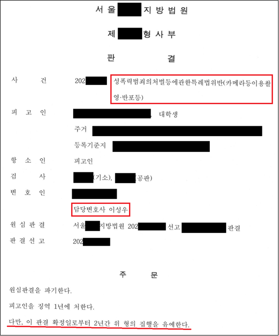 카메라등이용촬영죄는 성범죄 중 하나로 처벌이 엄중하며, 특히 촬영물 유포까지 이뤄진 경우 실형 가능성이 매우 높습니다.