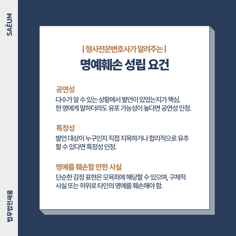 단순한 감정 표현(예: 욕설)은 모욕죄에 해당할 수 있으며, 명예훼손이 되기 위해서는 구체적인 사실을 기반으로 해야 합니다. 또 이 사실이 사실이든 허위든 타인의 명예를 훼손할 수 있어야 합니다.