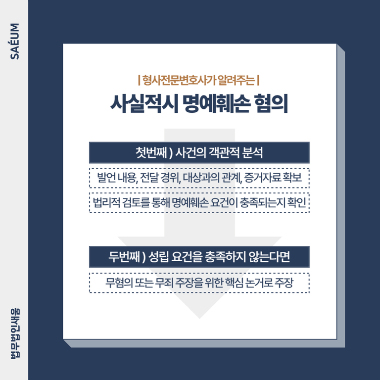 사실적시 명예훼손 혐의를 받는 경우, 가장 먼저 해야 할 일은 사건의 객관적 분석입니다. 발언의 내용, 전달된 경위, 대상과의 관계, 증거 자료 등을 바탕으로 명예훼손 요건이 충족되는지를 따져야 합니다.