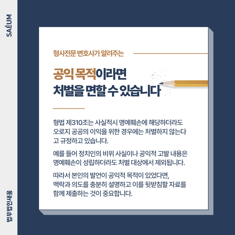 형법 제310조는 사실적시 명예훼손에 해당하더라도 오로지 공공의 이익을 위한 경우에는 처벌하지 않는다고 규정하고 있습니다. 예를 들어 정치인의 비위 사실이나 공익적 고발 내용은 명예훼손이 성립하더라도 처벌 대상에서 제외될 수 있습니다.