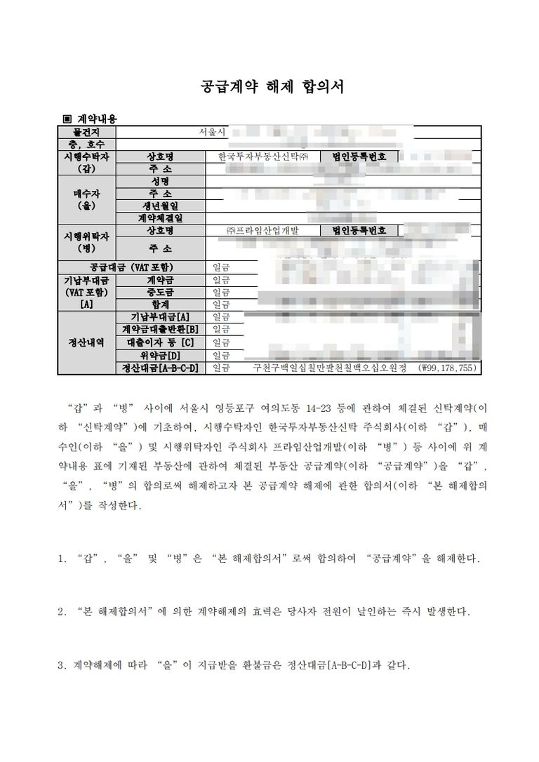 해당 사건은, 여의도 소재 하이엔드 오피스텔의 분양계약을 해제하기 위하여, 3명의 공동투자자들이 저희 사무실에 내방한 사건입니다.