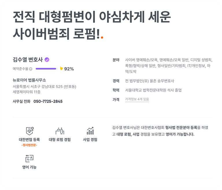 안녕하십니까? 사이버 범죄 로펌 뉴로이어의 김수열 대표 변호사입니다.