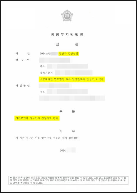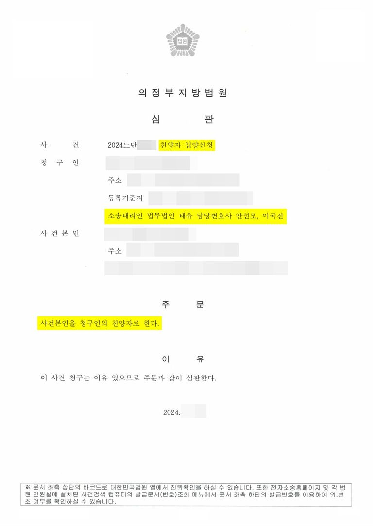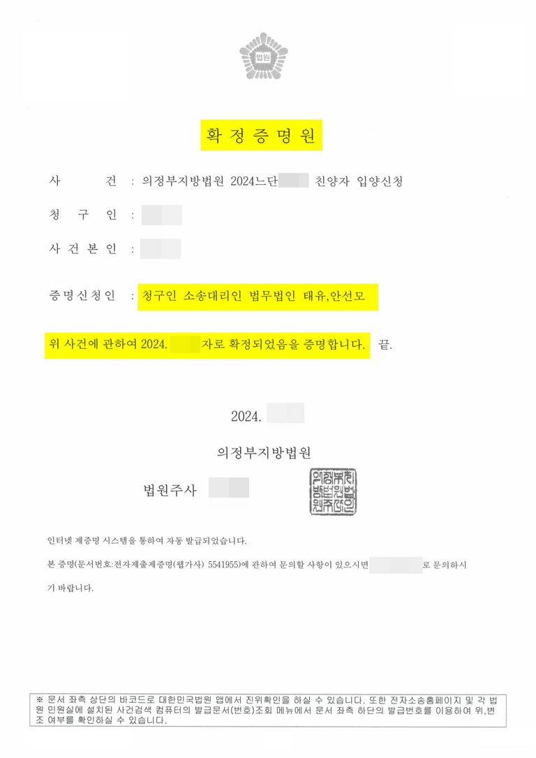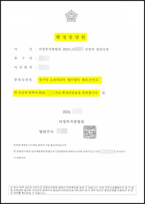 - 이 사건은 안정적으로 진행되어, 1회의 심문기일이 종결된 후 바로 인용 결정을 담은 심판문을 수령할 수 있었습니다. 대부분의 가사 사건이 그렇듯 친양자입양심판 청구의 사건 또한 재판이 인용 및 확정된 후 주소지 등의 행정복지센터에 신고까지 진행되어야 사건이 마무리가 되기 때문에 안변은 의뢰인께 확정기한인 14일을 기다린 뒤 1개월 이내에 심판문 및 확정증명원을 지참하여 입양신고를 진행하실 것을 안내드렸으며, 확정일에 지체 없이 서류를 준비하여드려 신분관계가 정리될 때까지 끝까지 조력을 다 하였습니다.