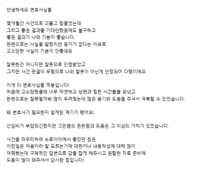 실력 있는 조력자와 제대로 된 상담 1번만 받아봐도 무죄 가능성에 대한 현실적인 조언을 얻으실 수 있을 거라 생각합니다.