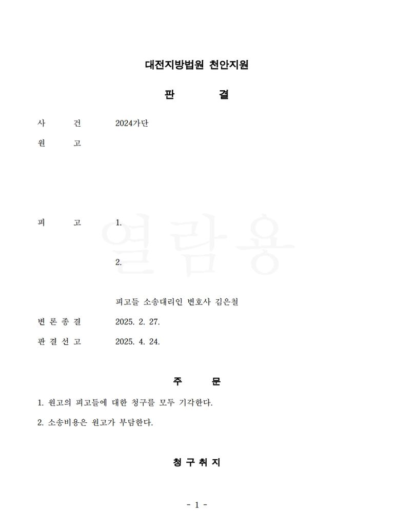 법원은 피고들 소송대리인의 주장을 인정하여 원고의 피고들에 대한 청구를 기각하는 판결을 선고 하였습니다.