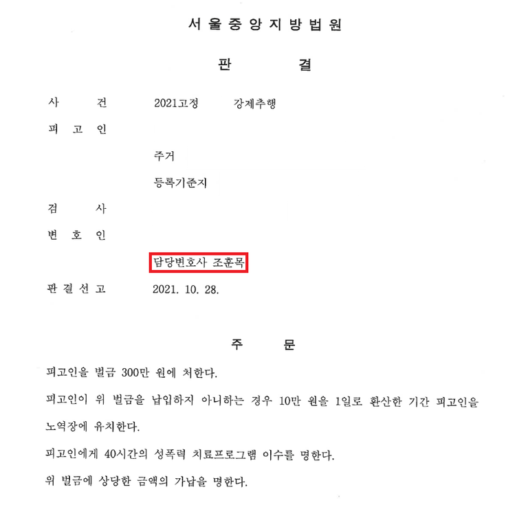 그 결과, 법원은 '피고인이 자신의 잘못을 반성하고 있는 점, 피해자와 합의하여 피해자가 피고인의 처벌을 원하지 않는 점, 피고인이 범죄로 처벌받은 전력이 없는 점' 등을 고려하여 피고인(의뢰인)에게 벌금 300만원의 형을 선고하였고, 기타 공개명령, 고지명령 및 취업제한명령도 전부 면제하였습니다.