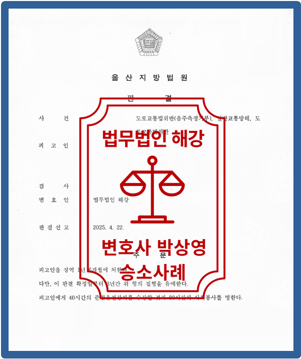 ![[집행유예, 음주측정거부+교통방해+음주운전]](/_next/image?url=https%3A%2F%2Fd2ai3ajp99ywjy.cloudfront.net%2Fuploads%2Ftitleimage%2Foriginal%2F5c2ec4dad664b0772b01bd4a-original.jpg&w=3840&q=75)