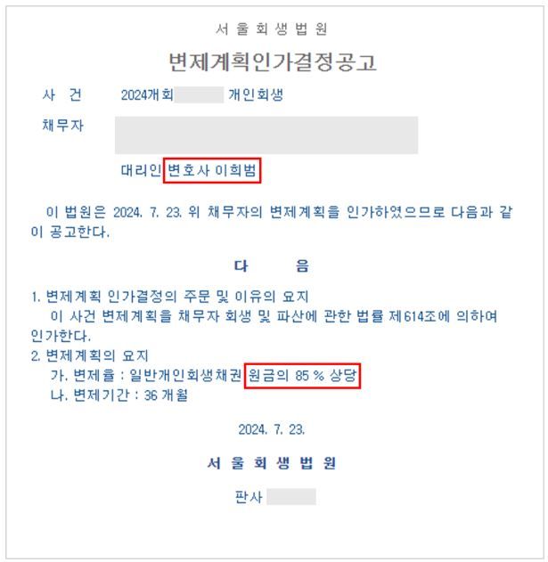 이에 저희 사무실은 채무자의 기 근로계약서와 현 근로계약서 및 채무자의 소득이 감소하게 된 원인을 구체적으로 진술하고 소명자료를 같이 제출하였고, 법원은 이를 받아들여 조건부 인가 없이 신청 당시에 제출한 변제계획안을 그대로 인가하여 주었습니다.