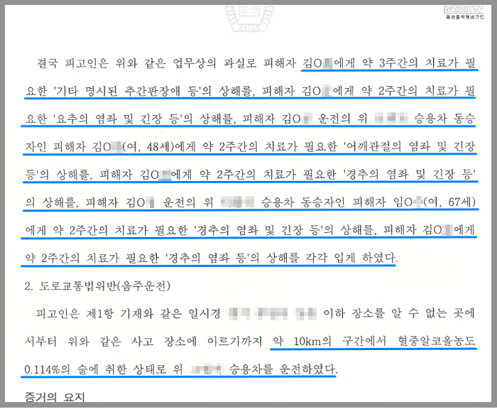 중앙부처 공무원인 의뢰인은 새벽까지 술을 마신 후 오전에 출근을 위해 운전대를 잡았다가 고속도로에서 차량 4대를 충격하는 대형 교통사고를 내고 말았습니다. 의뢰인의 당시 혈중알코올농도는 0.114%로 숙취운전으로는 매우 높은 수치였고, 이 사고로 인해서 피해자 6명이 상해를 입게 되었습니다. 의뢰인은 결국 도로교통법위반(음주운전)과 교통사고처리특례법위반(치상) 혐의로 재판을 받게 되었습니다.