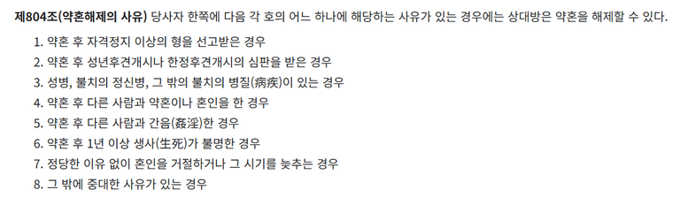 이러한 약혼 단계에 있던 관계에서도 민법 제804조에서 규정하는 약혼 해제 사유가 있다면 일방은 특별한 법적 절차 없이 의사표시만으로 약혼 상태를 해제시킬 수 있습니다.