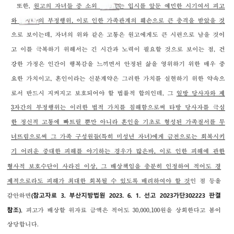 이에, 본 변호사는 소장을 제출한 이후에도 추가 준비서면을 제출하고 변론이 종결된 이후에도 추가 참고서면을 제출하면서 ① 피고와 원고 배우자는 2년 이상 서로 애정표현이 섞인 메시지를 주고받거나 피고의 집 등에서 데이트를 즐기며 부적절한 관계를 유지하였다는 점, ② 원고는 우연한 기회에 피고와 원고 배우자의 부정행위를 알게 되었던 것으로 원고가 부정행위를 알아채지 못하였다면 피고와 원고 배우자의 관계가 지속되었을 것이라는 점, ③ 원고와 원고 배우자의 혼인기간이 20년에 달하고 슬하에 2명의 자녀가 있다는 점, ④ 원고와 원고 배우자의 혼인관계는 피고와 원고 배우자의 부정행위로 신뢰가 상실되는 등 사실상 파탄에 이르렀다는 점, ⑤ 피고는 원고와 직접 대면하여서도 '오해할 만한 행동 한 적 없다'고 부정행위 사실을 부인하면서 사과 한마디도 하지 않는 후안무치한 태도를 보였다는 점, ⑥ 피고는 준비서면에서조차 '피고와 원고 배우자의 만남이 짧은 기간 동안 이루어진 것에 불과하다'거나 '원고 부부로부터 공갈, 협박 등 피해를 입었다'는 거짓 주장을 늘어놓고 있는바 피고가 부정행위 이후 이 사건 소송 과정에 이르기까지 보인 언동과 태도, 대응 방식 등에 비추어 볼 때 피고가 본인의 잘못을 전혀 반성하지 않고 있음은 자명하다는 점, ⑦ 피고와 원고 배우자가 주고받은 메시지를 보면 피고가 원고 배우자에게 수시로 안부를 묻거나 만날 것을 제안하고 수차례에 걸쳐 미래를 약속하는 취지의 메시지를 보내는 등 피고가 더 적극적으로 부정행위를 주도하거나 또는 관계 해소를 적극적으로 막는 등 주도적·적극적인 역할을 수행하였다는 점 등을 고려하면 피고는 원고에게 위자료로 최소한 3,000만 원을 지급해야 한다고 주장하였습니다.