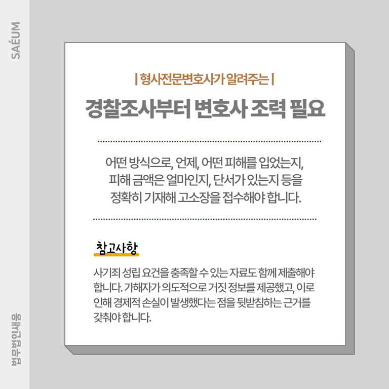 또한 사기죄 성립 요건을 충족할 수 있는 자료도 함께 제출해야 합니다. 가해자가 의도적으로 거짓 정보를 제공했고, 이로 인해 경제적 손실이 발생했다는 점을 뒷받침하는 근거를 갖추어야 검찰 송치가 제대로 이루어질 수 있습니다.