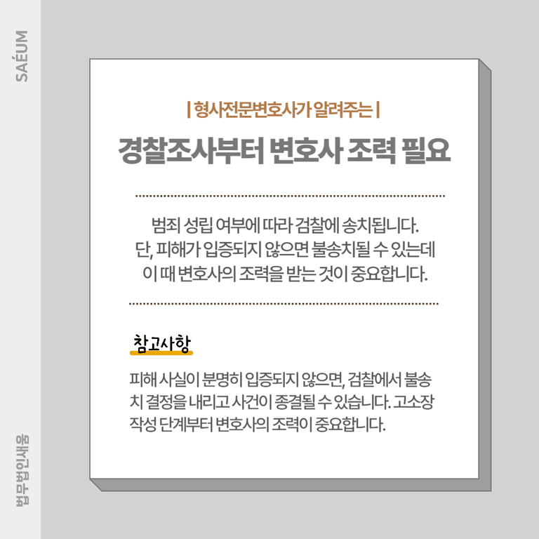 하지만 현실적으로는 직접 경찰 조사를 받고 피해 사실을 입증해 가해자가 처벌을 받게 하는 일이 생각보다 쉽지 않습니다. 증거가 부족하거나 진술이 불분명할 경우, 혐의점이 명확하지 않다는 이유로 불송치 결정이 나올 수 있으니 주의하셔야 합니다.