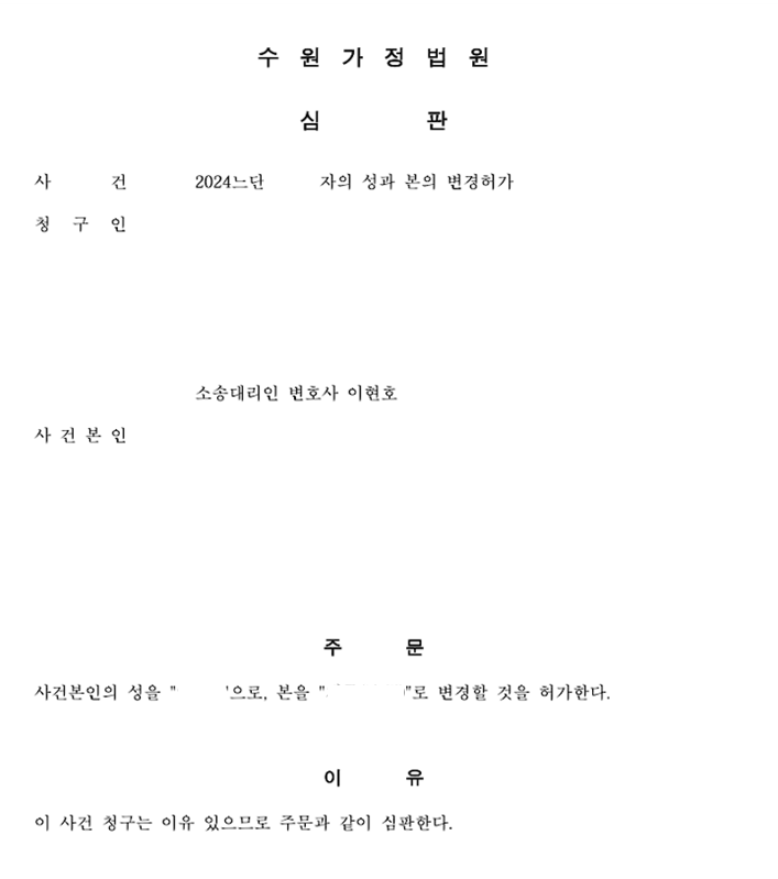 위와 같은 논리를 바탕으로 법원에 의견서를 제출한 결과, 성인임에도 불구하고 법원은 ‘성본변경 필요성 있음’을 인정하여 신청을 인용하였습니다.