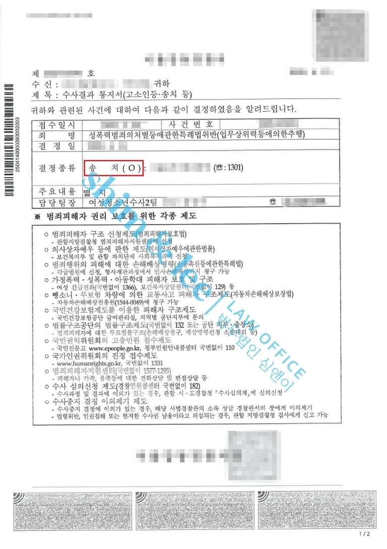 -결국, 가해자는 자신의 직무상 지위를 이용해 피해자를 추행한 사실이 인정되었습니다. 또한, 그 지위로 인해 피해자가 즉각적으로 저항하지 못한 피치못할 사정 점 또한 인정되어 업무상위력추행 혐의로 검찰에 송치되었습니다.