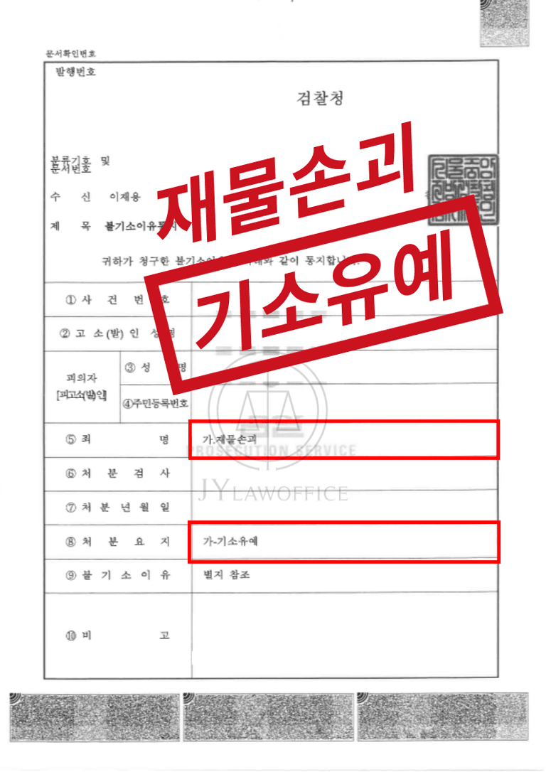 이와 같은 본 형사 전문 변호사의 조력에 따라 의뢰인은 재물손괴 혐의에서 기소유예의 불기소 처분을 받고 사건을 종결시킬 수 있었습니다.