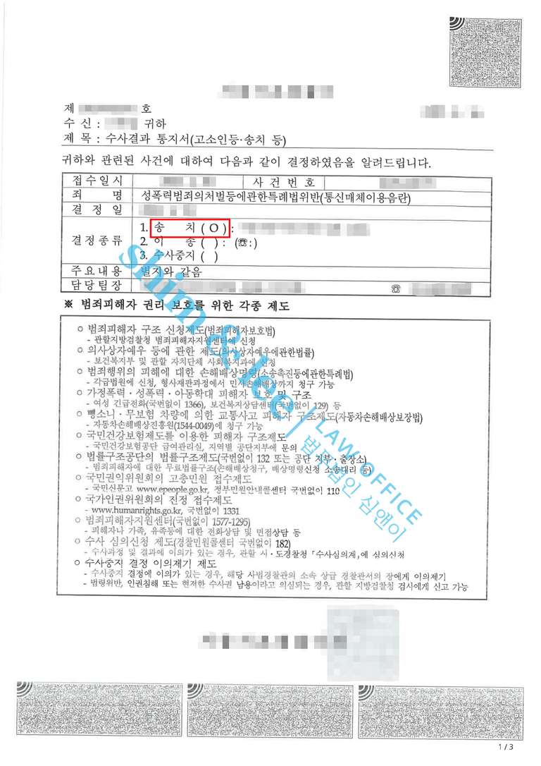 - 가해자는 경찰 조사 과정에서 의뢰인에게 문자를 보낸 사실은 인정하면서도, 성적 욕망은 없었다며 혐의를 부인하였습니다. 그러나 수사관은 심앤이가 제출한 증거와 법리적 설명을 받아들여, 가해자의 발언 내용과 정황을 종합적으로 판단한 끝에 통신매체이용음란죄에 해당한다고 보았고, 결국 사건은 가해자의 범행이 인정되어 검찰에 송치되었습니다.