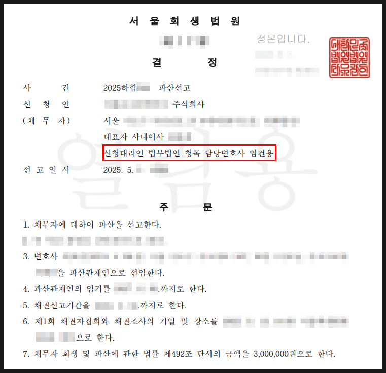 그리고 나서 의뢰인으로부터 회사와 관련한 여러 자료들을 수집하고, 이를 바탕으로 파산신청서를 완성하였으며, 파산신청서 접수 대표자 심문까지 문제 없이 준비해드렸다.