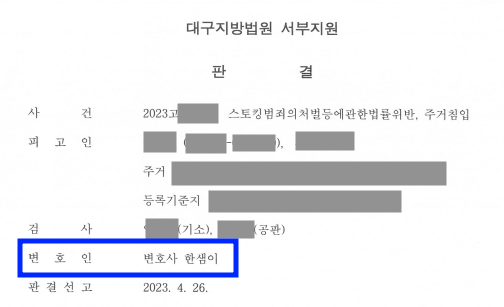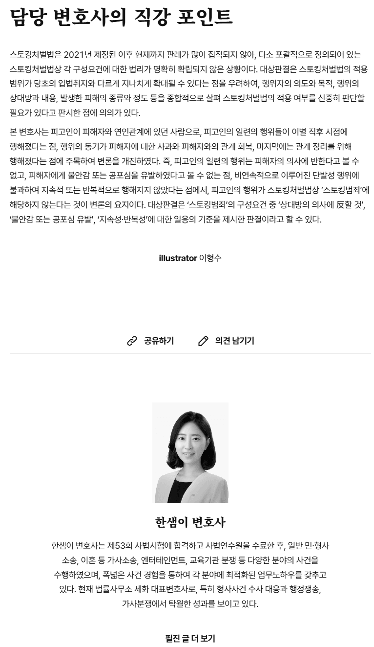 스토킹 무죄 판결을 이끌어내는 일이 쉽지 않다보니, 많은 변호사님들께서 제 사례를 참고해주시는 것 같아 저도 기쁩니다.