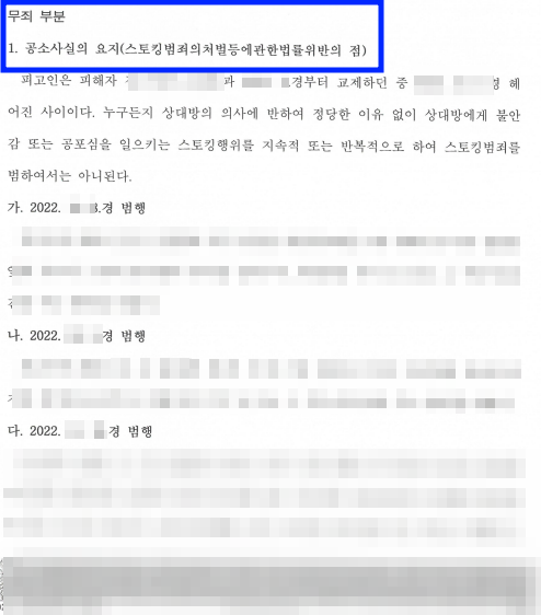 3. 의뢰인은 <스토킹처벌법위반죄(스토킹)>로 입건되어 경찰, 검찰에서 조사를 받았고, 수사 끝에 검찰로부터 불구속 기소되어 재판을 받게 되었습니다.