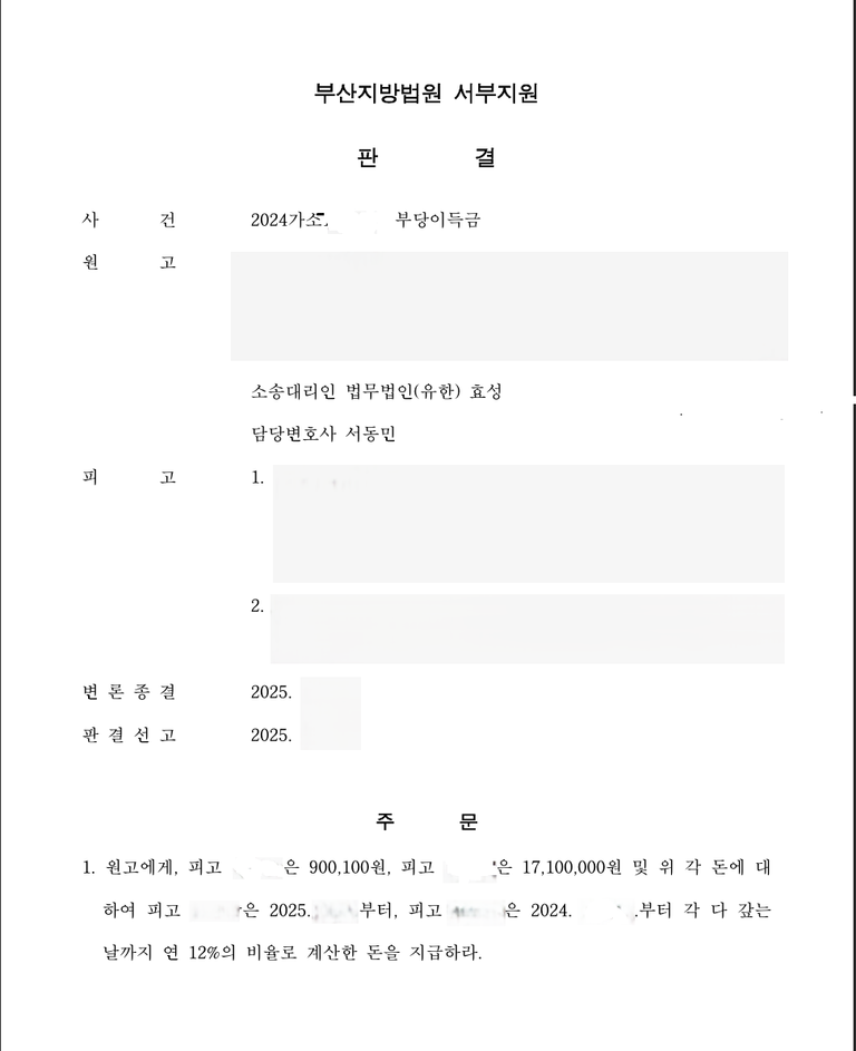 저는 즉각 입금 받은 자들을 피고로 하여 민사소송 부당이득반환청구소송을 제기하였고 법원은 원고 승소 판결을 선고하여 의뢰인은 피해액을 반환받았습니다.