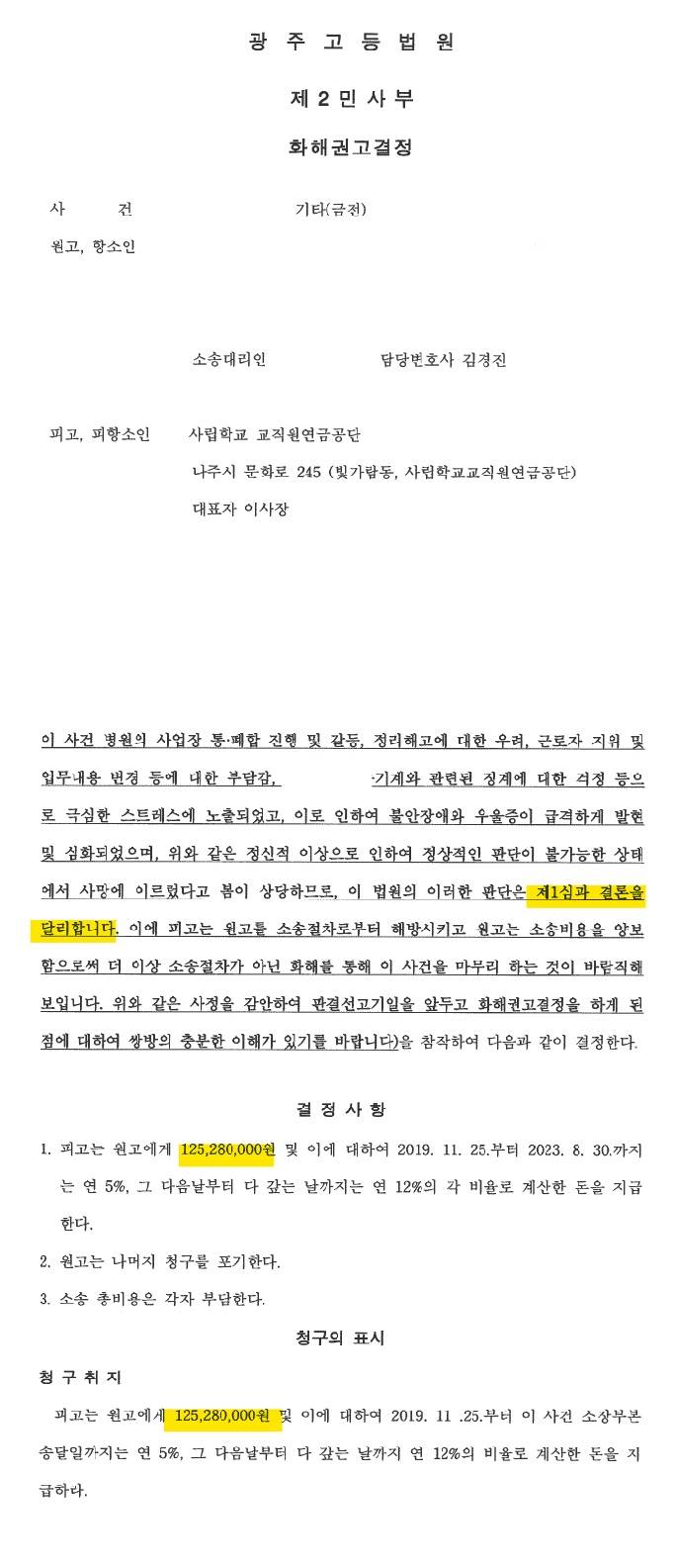 광주고등법원은 다음과 같은 내용의 원고의 청구취지 금액을 전부 인정하는 내용으로 화해권고결정을 제시하였으며, 피고 측이 이의를 제기하지 않아 해당 결정은 확정되었습니다. (전부 승소)