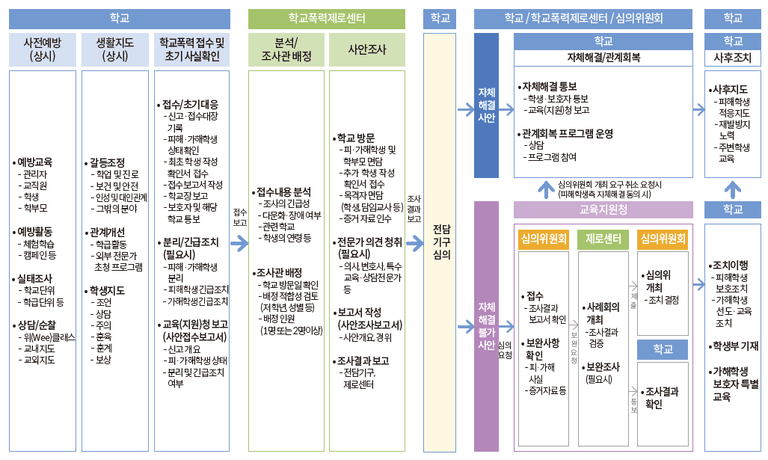 조금 복잡해보이죠? 간단하게 말씀드리면 중간 부분의 "전담기구 심의"부분 부터 봐도 무방합니다. 크게는 1) 자체해결 사안 2) 자체해결 불가사안으로 나위는데 자체해결 사안은 학교 내에서 종결 짓게 되고, 자체해결 불가사안은 교육청 학폭위로 올라가게 됩니다.