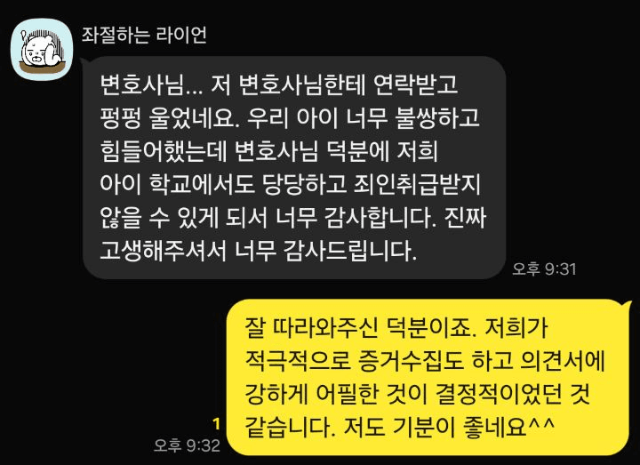 불처분 결정이 내려지던 순간, 그동안 마음의 짐을 견디며 힘들게 버텨왔던 아이와 부모님은 제게 진심 어린 감사의 눈물을 흘리셨습니다. 이 순간은 변호사로서 이루 말할 수 없는 보람과 감동으로 가슴 깊이 남았습니다. 아이가 다시 밝은 얼굴로 학교에 돌아갈 수 있다는 생각에, 저는 다시 한번 이 일을 하는 이유와 보람을 깊이 느꼈습니다.