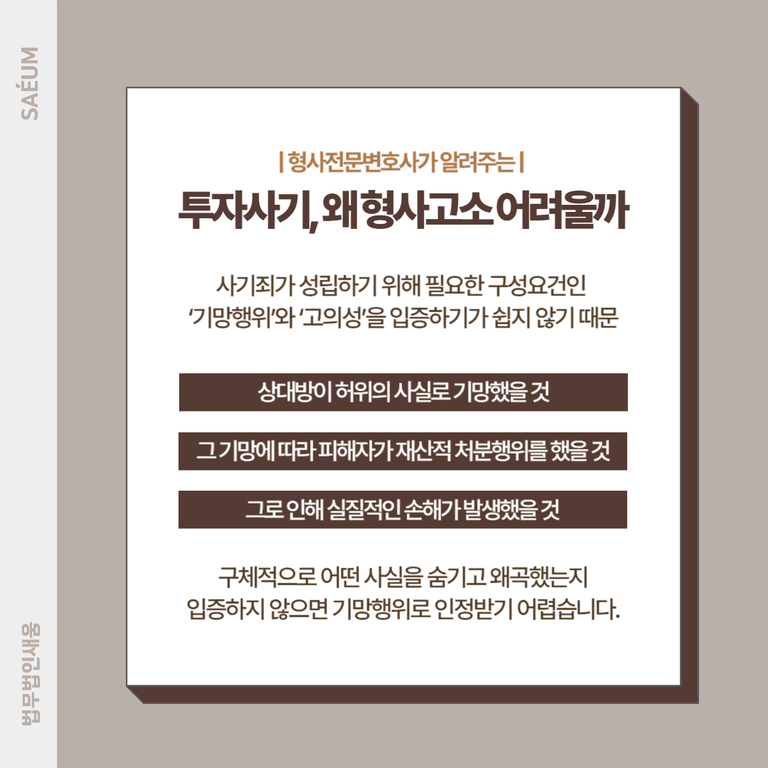 그러나 투자 상황에서는 투자자 스스로 판단하고 결정한 구조를 상대방이 유도했을 경우, 단순한 투자 실패로 보일 수 있습니다. 예를 들어, “수익이 날 수 있다”는 식의 발언이 있었다 해도, 상대방이 구체적으로 어떤 사실을 숨기고 왜곡했는지를 입증하지 않으면 기망행위로 인정받기 어렵습니다.