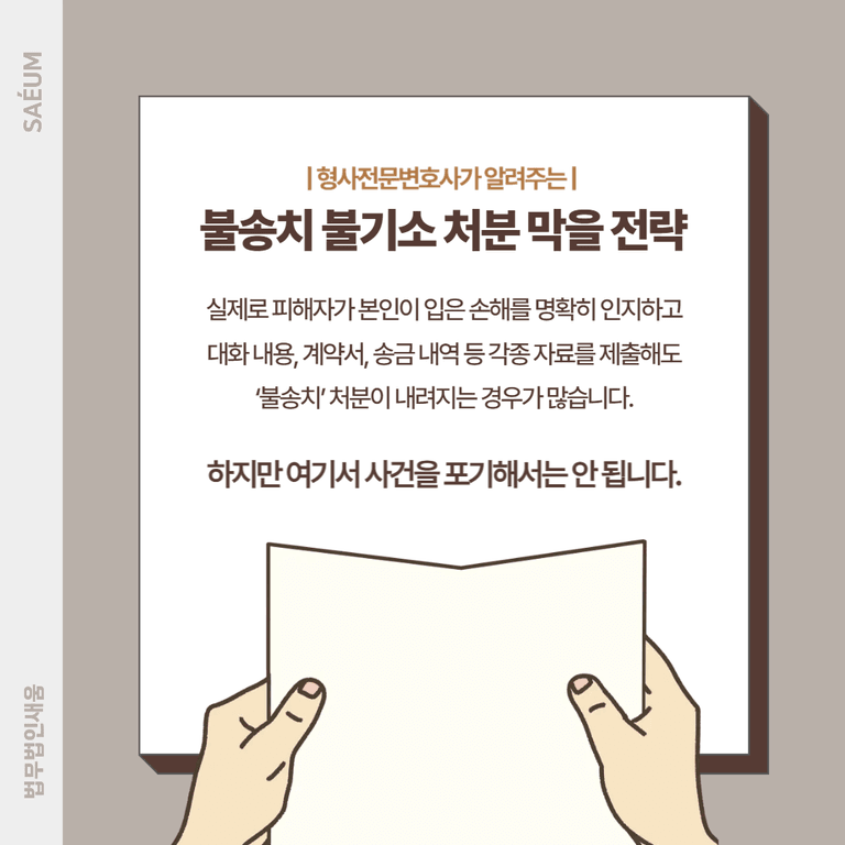 더 나아가, 사기 피해를 입었음에도 불구하고 증거 부족, 혐의 불성립 등의 사유로 불송치 또는 불기소 처분을 받는 경우도 많습니다. 이런 상황에서는 사건이 제대로 수사조차 되지 않은 채 종결되는 결과를 맞게 되죠.