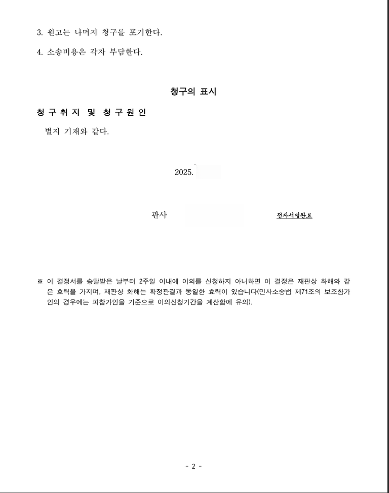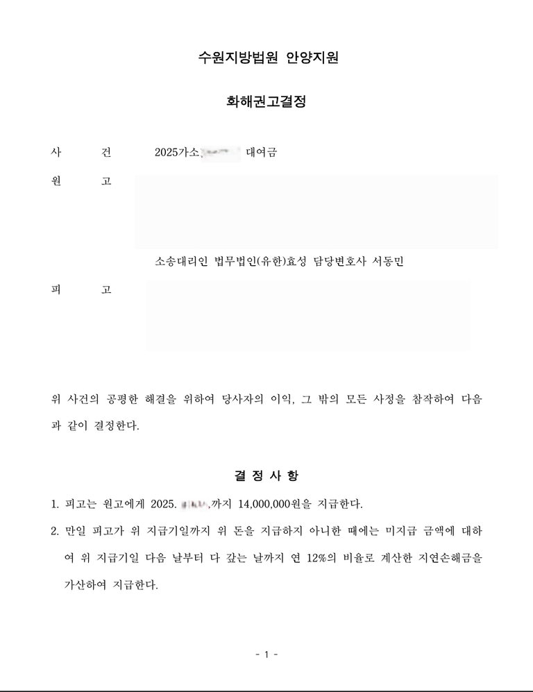 저는 즉각 대여금청구소송을 제기하여 기타 증거(통화녹음, 카톡, 문자, 거래내역 등)로 대여사실을 주장 입증하였고 법원은 피고가 청구액을 의뢰인에게 지급하는 내용의 화해권고결정을 내려 확정되어 의뢰인은 대여금을 변제받았습니다.