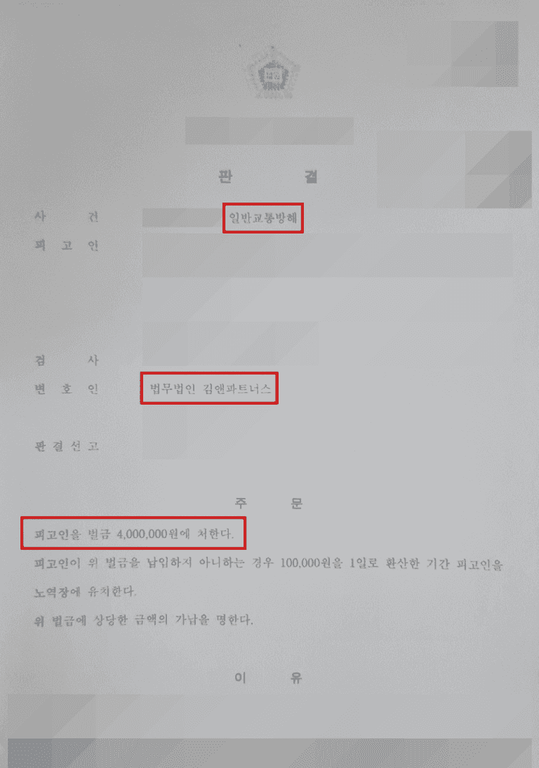 재판부는 의뢰인의 행위가 전체적인 교통 흐름에 영향을 미친 일부 책임은 인정하면서도, 저희 측의 입장을 상당 부분 받아들여 벌금 400만 원이라는 비교적 가벼운 처분을 선고하였습니다.