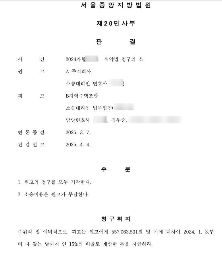 금융주선 업무를 영위하는 원고 법인이 피고 지역주택조합과 체결한 금융자문계약을 근거로 위약벌을 청구한 사건에서, 김우중 변호사는 피고 조합을 대리하였고, 주택법령상 "예산으로 정한 사항 외에 조합원에게 부담이 될 계약"임에도 총회 의결을 받지 않은 위약벌 조항은 피고 조합에게 효력이 없다고 주장하여 서울중앙지방법원에서 전부 승소한 사건입니다(상대방이 항소하지 않아 확정됨).