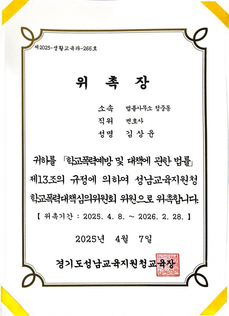 지난 4월 7일, 경기도성남교육지원청 학교폭력대책심의위원회 위원으로 위촉되었습니다.